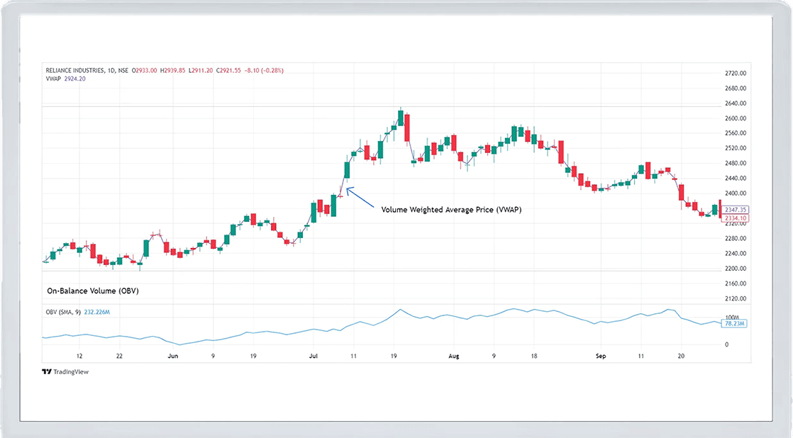 Volume Weighted Average Price (VWAP): VWAP calculates the average price of a stock over a specific period, weighted by volume. Traders often use VWAP as a benchmark to see whether the current price is fair compared to the day’s trading activity.