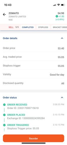 - We can see that the Stoploss order has completed at 55.05 and the Target order of 61.10 has been canceled.