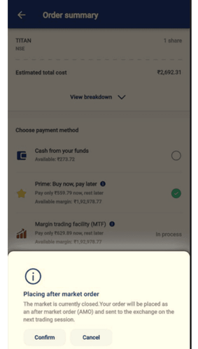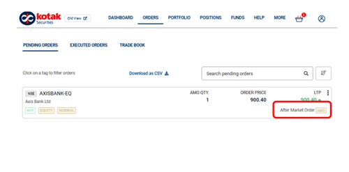 You can place AMO just like you place a normal buy/sell order. The app will automatically prompt you to convert the order to AMO when it is placed outside market hours. You can find the placed order under open orders with an AMO tag until it gets executed.