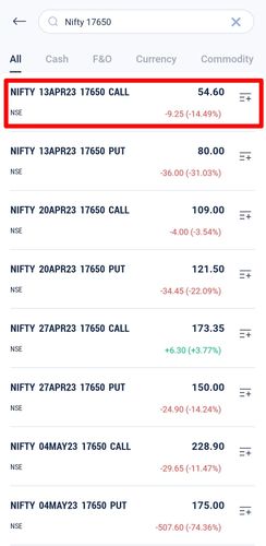 - Once you click on search you have to type the name of the scrip and the strike you want to trade in.e.g. “NIFTY 18000”. You will see the call and put option contracts of different expiries with the most recent expiry contract at the top and so on and so forth.