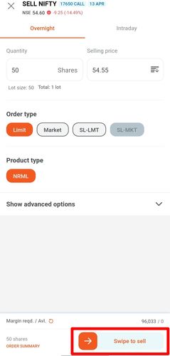 - Once you click on sell you have to enter the no. of quantity you want to trade and select the option between market or limit. You can also choose to add a stop loss by enabling the “Add stop-loss trigger” toggle. You also have an option to switch to MIS order (intraday) by enabling the “Auto square off” toggle.