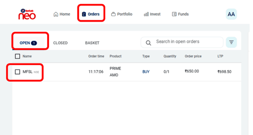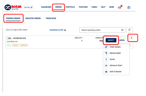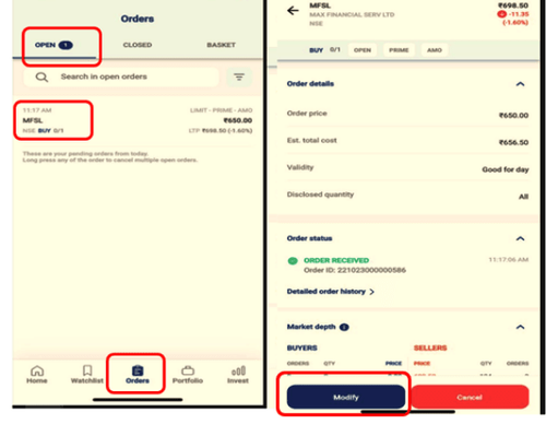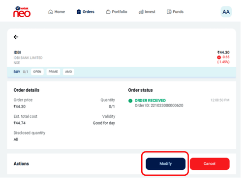 If the first leg of your cover order has been executed, you will not be able to modify the first leg. You will only see the option to modify the stop loss order under both tabs. Click on the modify stop loss button to modify the stop loss.