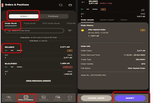 If the first leg of your cover order has not been executed, you can modify it by clicking on the modify button in the order tab. You can only modify the execution price and not the number of shares. To modify the stop loss order leg of your cover order switch to the stop loss order tab and click on modify stop loss. Enter the stop loss price and swipe to modify.