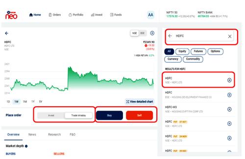 - Search a Stock → Select → Slide on Trade Intraday → Buy