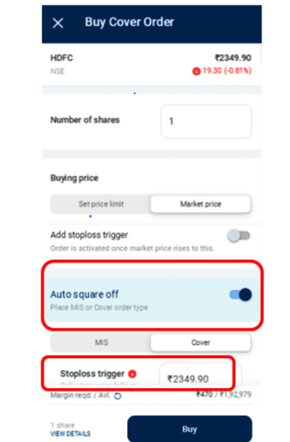 - Slide on Auto Square Off → Add Stop Loss Trigger → Buy