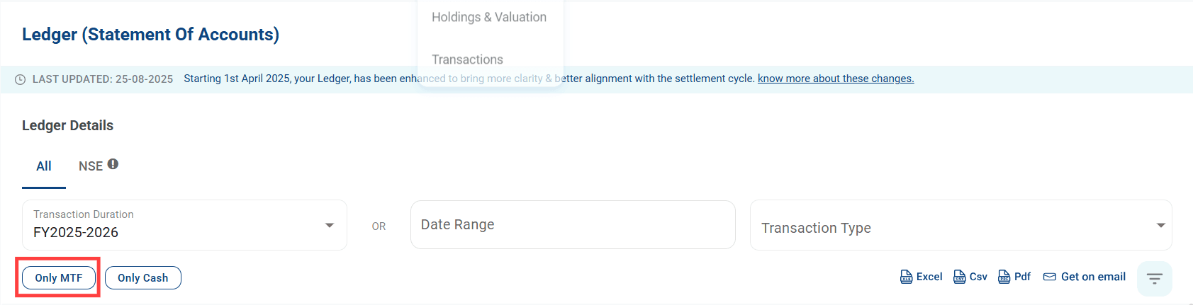 You can view your MTF ledger by clicking on the ‘Only MTF’ filter on your ledger. This ledger reflects your MTF trades, realized profit/loss, and interest charges, including brokerage charges until your MTF book becomes zero.