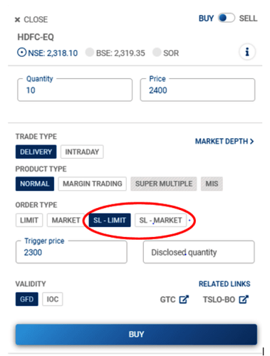 To place a cover order, you can select either SL-Market or SL-Limit and enter the Stop Loss trigger price.