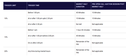 The index-based market-wide circuit breaker system applies at 3 stages of the index movement, either way viz. at 10%, 15% and 20%. These circuit breakers when triggered bring about a coordinated trading halt in all equity and equity derivative markets nationwide. The market-wide circuit breakers are triggered by movement of either the BSE Sensex or the Nifty 50, whichever is breached earlier.